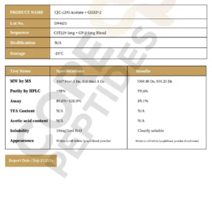 CJC-1295 is a molecular compound that exhibits an apparent binding affinity for the growth hormone-releasing hormone (GHRH) receptors, potentially inducing growth hormone release by pituitary cells. CJC-1295 is derived from GHRH 1-29, which is considered to represent the functional sequence of the initial 29 amino acids of GHRH. The peptide CJC-1295 has undergone tetra substitution and modification through the addition of a drug affinity complex (DAC) component. This DAC component appears to bind to plasma proteins and may enhance the pharmacokinetic profile of CJC-1295.(1)