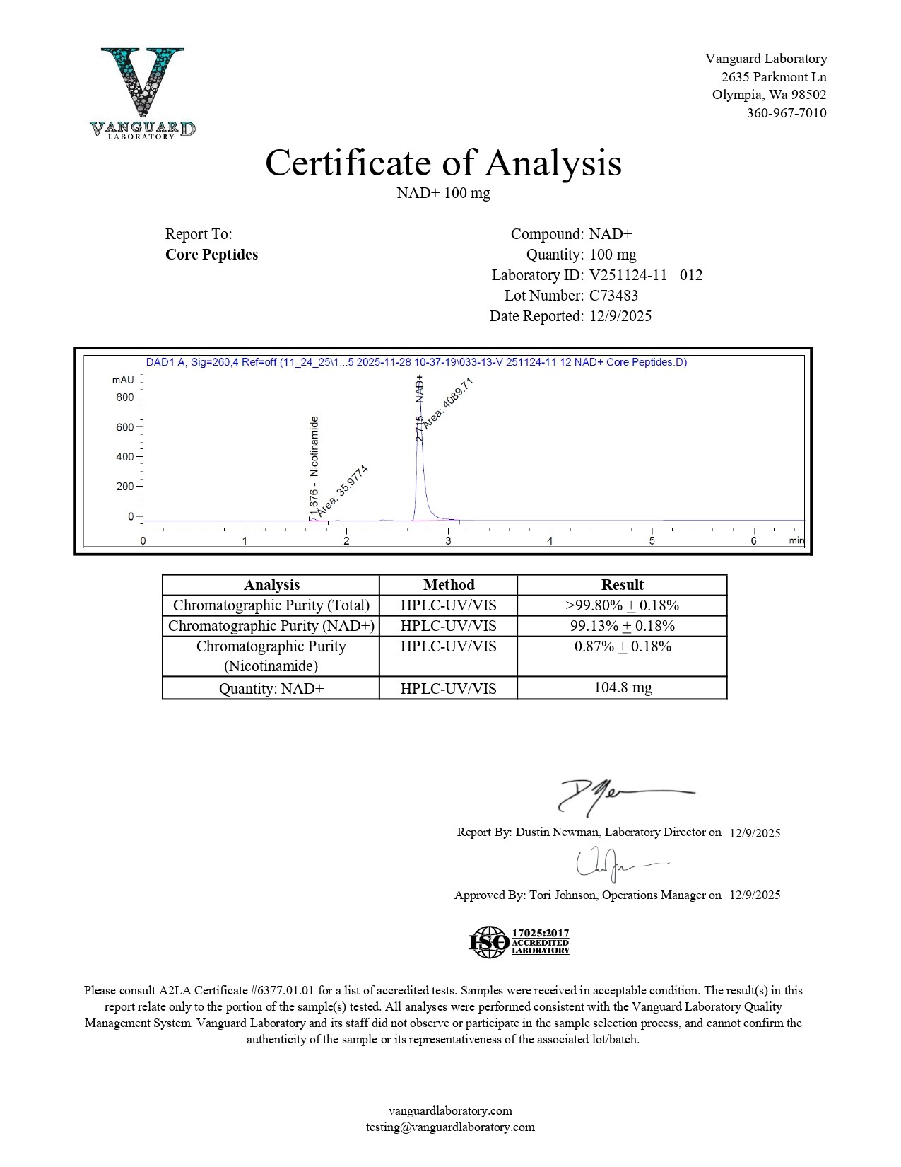 NAD+ is an acronym for Nicotinamide Adenine Dinucleotide, an endogenous nucleotide that is considered to regulate primary functions such as metabolism, energy production, and DNA repair. It is also considered to act as a secondary messenger via calcium-dependent signaling mechanisms, possibly serving as an immunoregulatory component.(1)(2) NAD+ is considered by researchers to be naturally synthesized via the de novo mechanism of converting the amino acid tryptophan through several enzymatic steps. Researchers posit that there are five components to NAD+ synthesis, including tryptophan, nicotinamide, nicotinic acid, nicotinamide riboside, and nicotinamide mononucleotide.(3) Once synthesized, research suggests it exerts over 500 enzymatic reactions and cellular processes(12) to aid metabolic activities. Essentially, it is suggested to act as a coenzyme in redox functions, converted to NADH (the energy-carrying form of NAD+), which may involve other metabolic pathways.